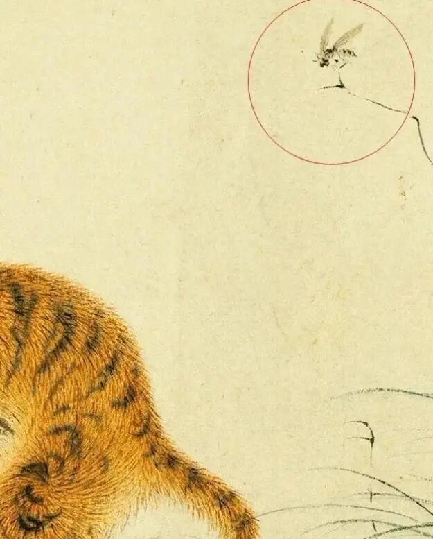 不得不说,华喦的笔力真实太绝了,老虎的绒毛根根分明,柔嫩蓬松;小蜜蜂虽小,翅膀上的纹路王人一清二楚。一怂一凶,一大一小,反差感拉满,画面蓦地活了。