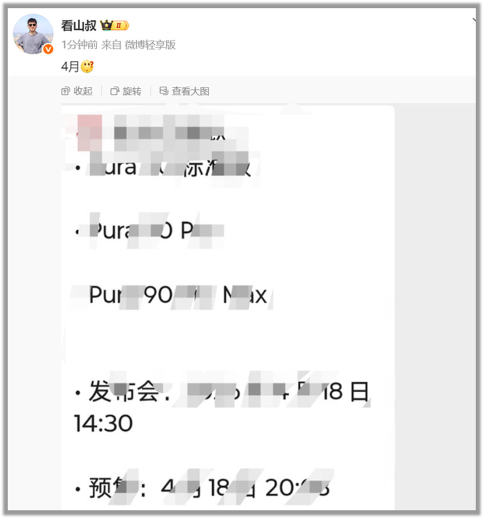 此外,日前,华为经销商、数码博主“看山叔”也曝光了一张疑似华为Pura 90系列新品和发布时辰的带有马赛克的截图。固然截图上一经被打上了马赛克,然则研究当今曝光的信息,如故能看个梗概。图上不错看到,这次Pura 90系列将带来程序版、Pro版和Pura 90 Pro Max版三款机型,这与之前的爆料相一致。