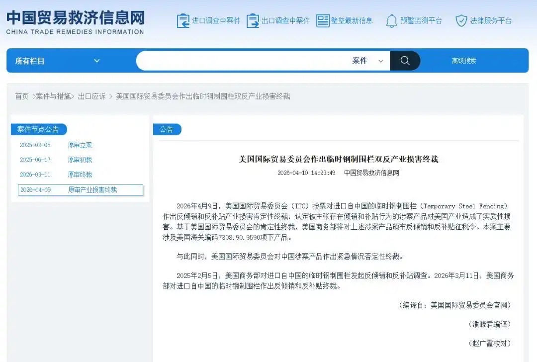 2026年4月9日,好意思国海外买卖委员会(ITC)投票对入口自中国的临时钢制围栏(Temporary Steel Fencing)作出反推销和反补贴产业毁伤笃定性终裁,认定被方针存在推销和补贴步履的涉案产物对好意思国产业酿成了现实性毁伤。基于好意思国海外买卖委员会的笃定性终裁,好意思国商务部将对上述涉案产物颁布反推销和反补贴纳税令。本案主要触及好意思国海关编码7308.90.9590项下产物。