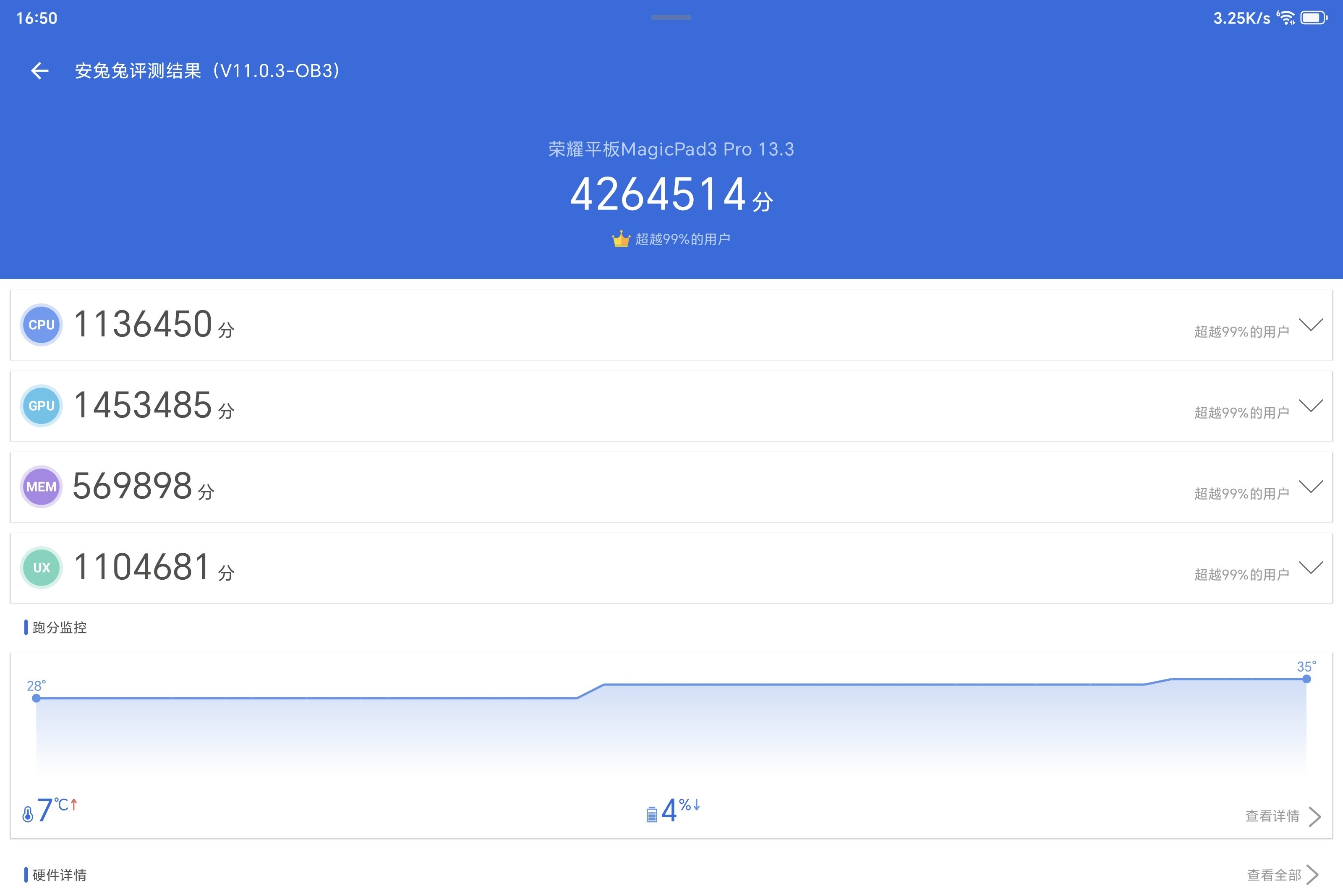 在性能上,荣耀MagicPad3 Pro首发第五代骁龙8至尊版旗舰芯片,朝上平板行业半年时辰,如斯快节拍的上市也酿成了唯一无二的阛阓竞争力。第五代骁龙8至尊版选择台积电3nm N3P工艺,全大核缠绵,CPU性能进步20%、GPU性能进步23%、NPU性能进步高达37%。在跑分上,荣耀MagicPad3 Pro室温下安兔兔跑分高达4264514分,断层朝上此前行业第一100多万分,是当之无愧的行业第一。