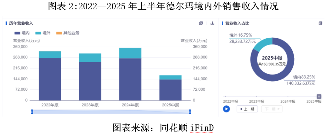 功绩方面,本年上半年,德尔玛的营收和净利润增速跟2024年全年比较大幅放缓,其中,境外收入同比下滑,或反馈出德尔玛在国际商场的拓展不足预期。
