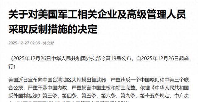 2025年末,中国际交部一纸制裁公告,让全球军工产业和成本市集同期调遣。 12月26日公布的反制门径,精确锁定20家好意思国军工企业和10名高管,冻结金钱、切回绝易、拒发签证三项门径同步落地,莫得依稀地带,莫得缓冲空间。