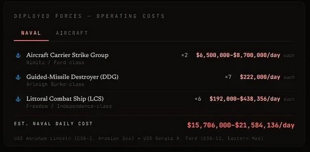 在装备损耗和能耗方面,网页列出了好意思艨艟机作战景况下平均每天或每小时的资本,本次活动中,舟师舰艇每天的使用资本在1500多万到2100多万好意思元之间,空军各种飞机资本在3000多万到7000多万好意思元之间。