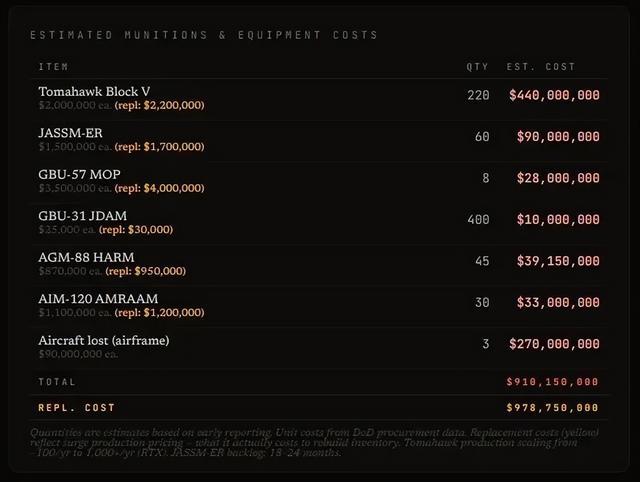 在弹药等奢靡品的资本上,网页瞻望好意思军破耗已杰出9亿好意思元。英国《泰晤士报》2日报说念中也提到了好意思军部分火器的价钱,数字和该网页基本一致。比较辛勤的火器价钱,报说念还提议了一个更严峻的问题:本次对伊朗的打击极地面奢靡了好意思军弹药库存,思要填补肖似“战斧”导弹这么的主力弹药库存,所需的分娩手艺可能高达1到2年。